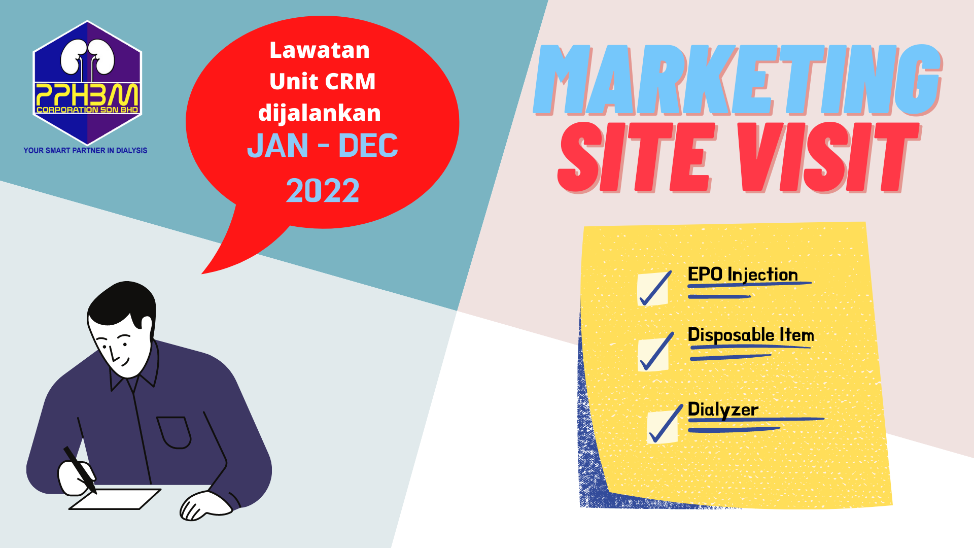 Unit Pemasaran PCSB akan membuat lawatan ke pusat dialisis ahli PPHBM bermula pada bulan Januari 2022 sehingga Disember 2022.